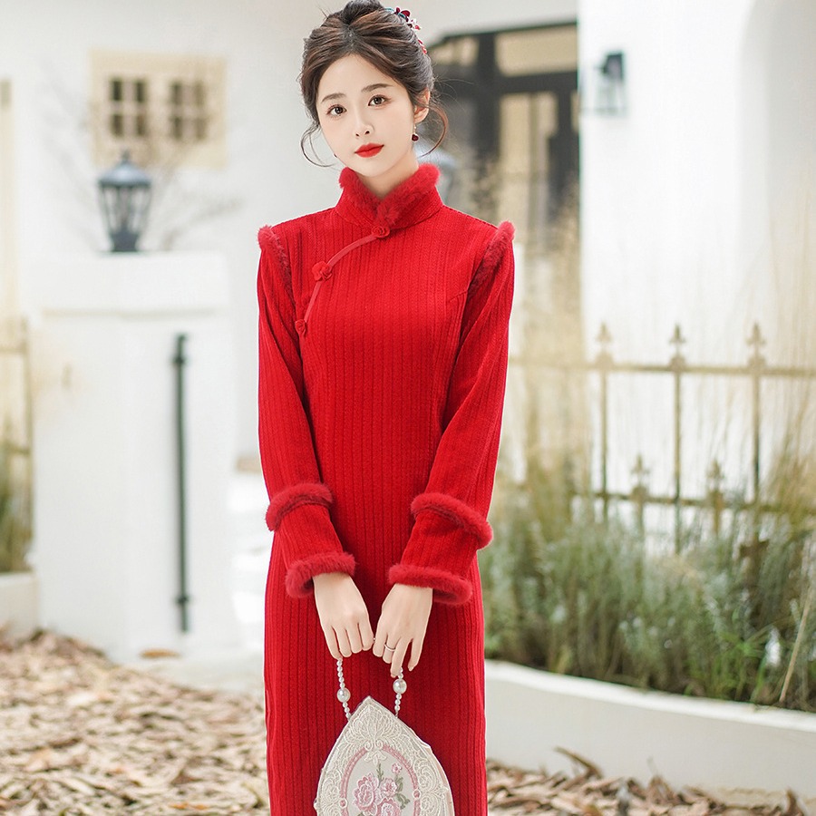 Gaun cheongsam ibu tahun 2022 berlapis bulu domba dan tebal, gaun pesta pernikahan, gaun wol, cheongsam untuk bepergian.