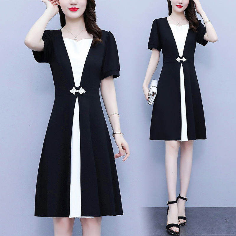 Gaun cheongsam wanita ukuran besar, gaun cheongsam baru gaya Tiongkok musim panas ukuran besar, Gaun pelangsing warna kontras mengurangi usia