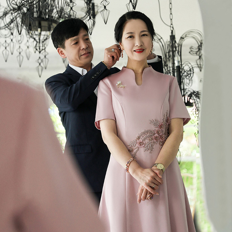 Xi gaun ibu-ibu-in-law baru merah muda musim semi dan musim panas gaun ibu pernikahan cheongsam dimodifikasi Xi mother-in-law Gaun perjamuan pernikahan ukuran plus