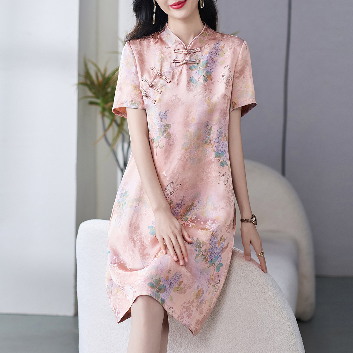 Rok Cheongsam Modifikasi Elegan Seksi Gaya Murni Gaun Terlihat Kurus Ramping Sehari-hari Membentuk Badan Pinggang Tinggi