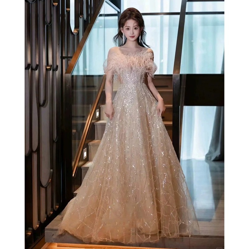 Gaun Pesta Pesta Gaun Pagi Kerah Berbulu Seksi Bahu Gaun Pertunangan Pengantin Wanita Host High-end