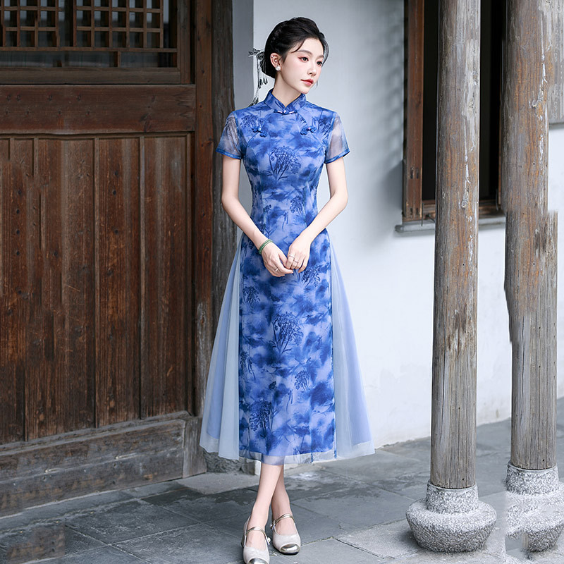 Cheongsam Cina baru 2024 gadis ditingkatkan musim panas rasa tinggi gaun elegan panjang muda elegan