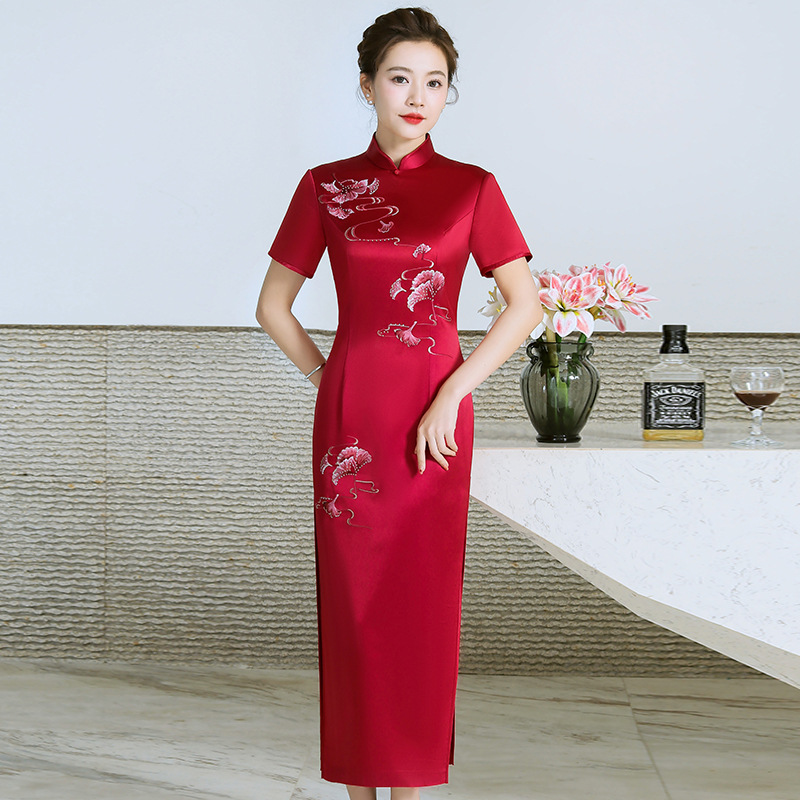 Gaun cheongsam ditingkatkan satin asetat baru gaun putar panjang ibu upacara pernikahan perjamuan ibu Xi