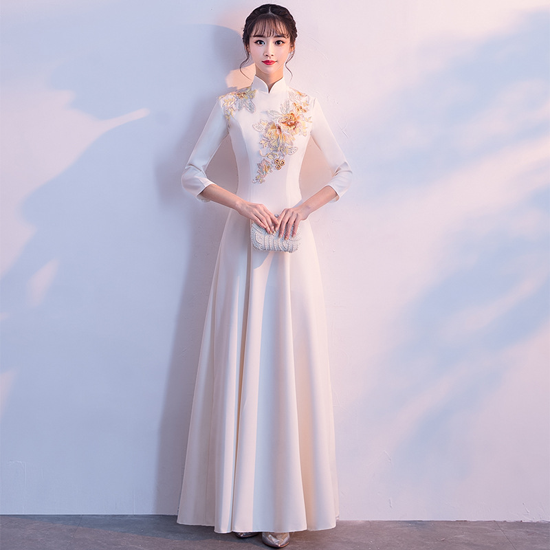 Gaun pesta pertunangan pengantin, gaun jamuan makan Cina, gaun pintu belakang lengan panjang musim semi