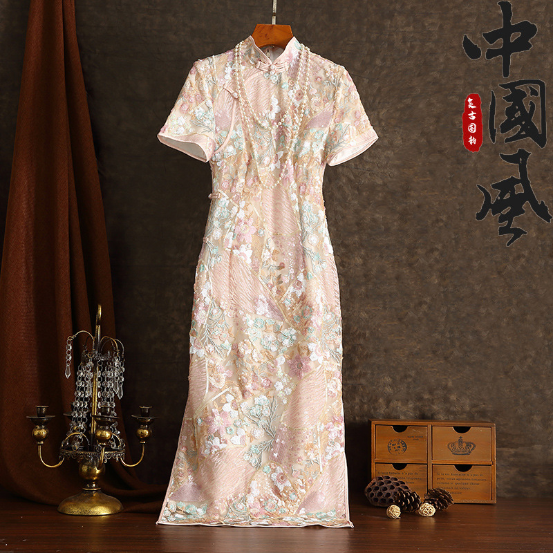 Tang love dress sutra cheongsam wanita, gaun rumbai beranyaman banyak sutra merah muda ditingkatkan untuk perempuan musim semi dan musim panas 2024