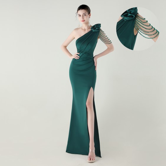 33678#单肩立体花朵订珠缎布压折性感高开叉晚礼服晚宴婚礼社交