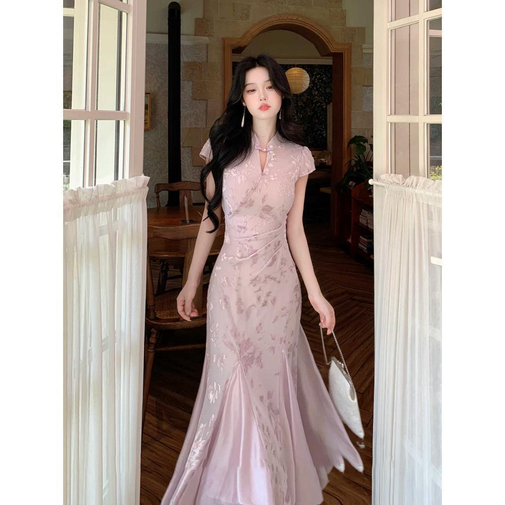 Gaun Cheongsam Modifikasi Gaya Tiongkok Baru Gaun Ekor Ikan Membentuk Pinggang Elegan Model Baru Musim Panas 2025 Wanita