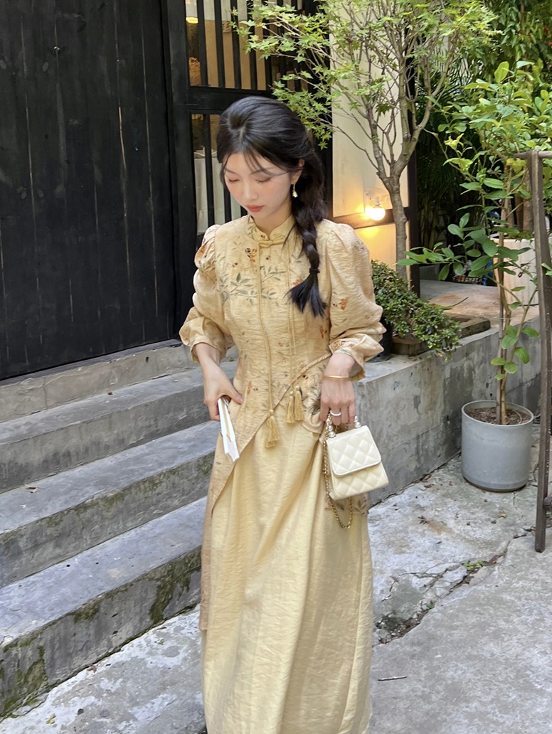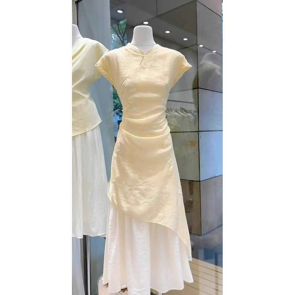 Pakaian Wanita Gaya Tiongkok Baru Model Tiongkok Baru 2025 Cheongsam Modifikasi Musim Panas Model Baru Rok Terusan Pinggang Kombinasi Tidak Beraturan Kuning