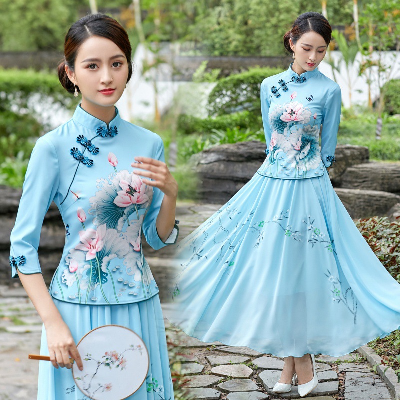 2023 musim panas baru ditingkatkan baru Cina cheongsam Lotus dicetak Tang setelan atas dengan rok setelan pakaian teh