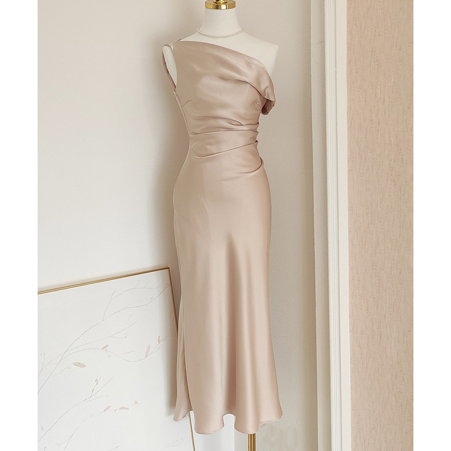 Rok Pakaian Elegan Gaun Malam Satin Asam Asetat Warna Polos Terlihat Langsing Pinggang Tertutup Lipit Bahu Miring Seksi