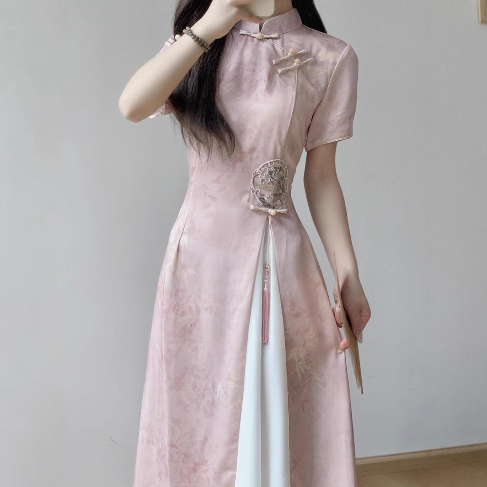 Gaun Cheongsam Dua Potong Palsu Sulam Sulam Gaya Tiongkok Baru Musim Panas Baru 2025 Elegan