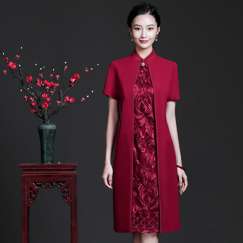 Gaun wanita musim panas baru pakaian ibu kualitas tinggi gaun bordir cheongsam ditingkatkan gaun dua potong palsu rambut generasi