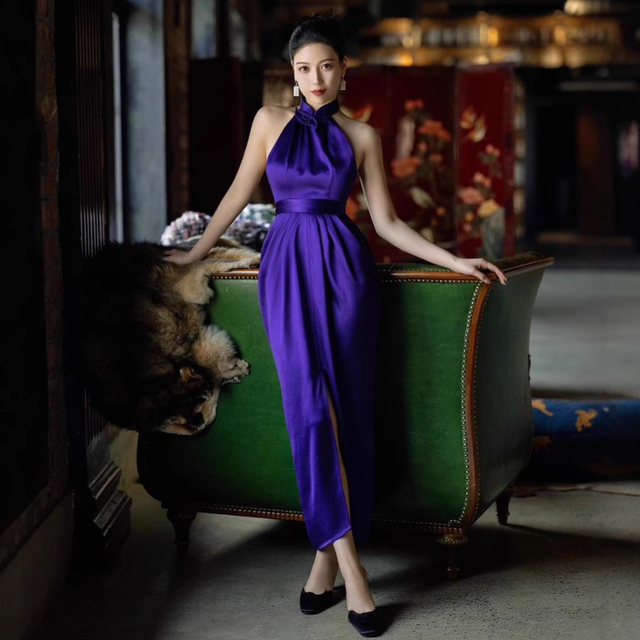 Gaun Malam Jubah Pagi Gaya Tiongkok Baru 2024 Gaun Gantung Leher Satin Asam Asetat Ungu Model Baru Pakaian Malam Perjamuan Desain Niche