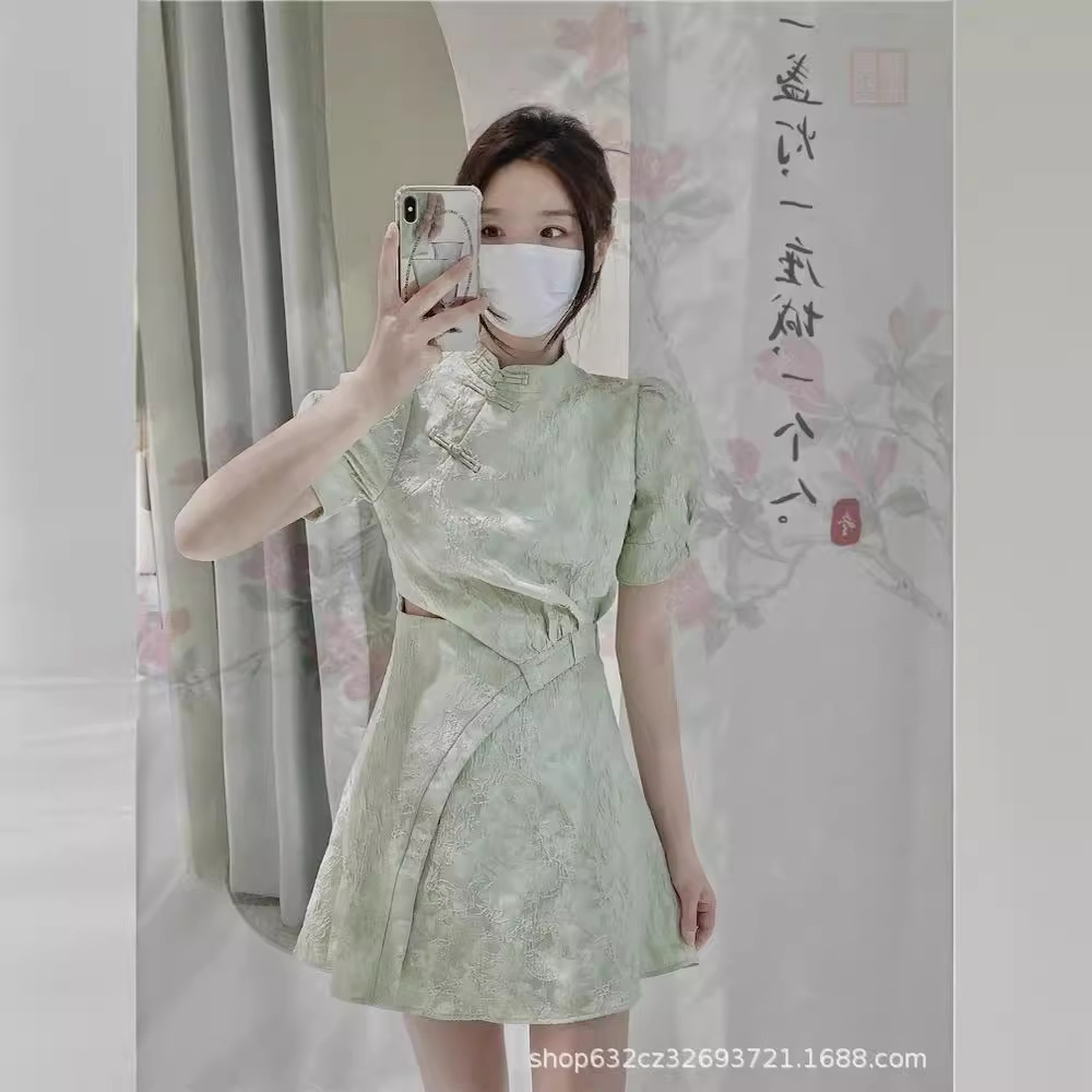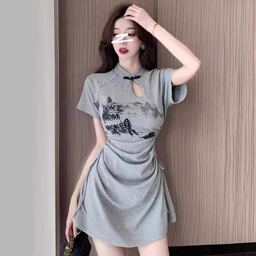 Baju cheongsam wanita lengan pendek, baju rok pinggul ketat pinggang berlipat, tali serut, baju lengan pendek, motif anak perempuan musim panas, gesper Cross-border