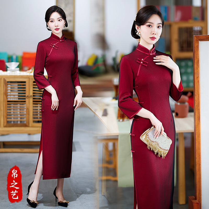 Gaun Panjang Cheongsam Burgundy Terbaru 2024 Musim Gugur/Dingin Model Slim Fit Elegan Gaya Cina Grosir Gaya Cina.