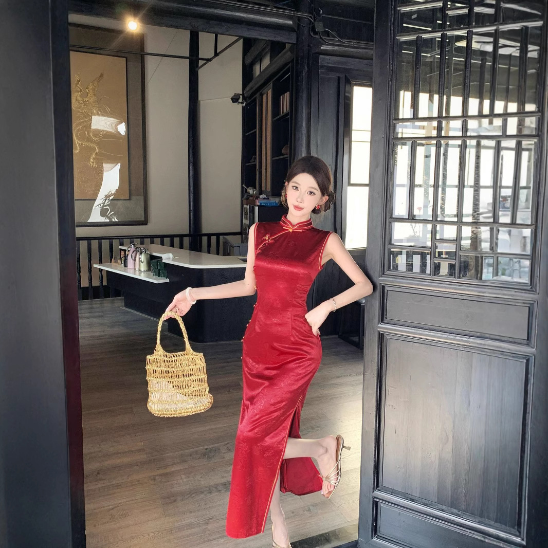 Gaun cheongsam baru untuk wanita, gaun ketat pinggang lembut jacquard modis desain baru Musim Panas 2024
