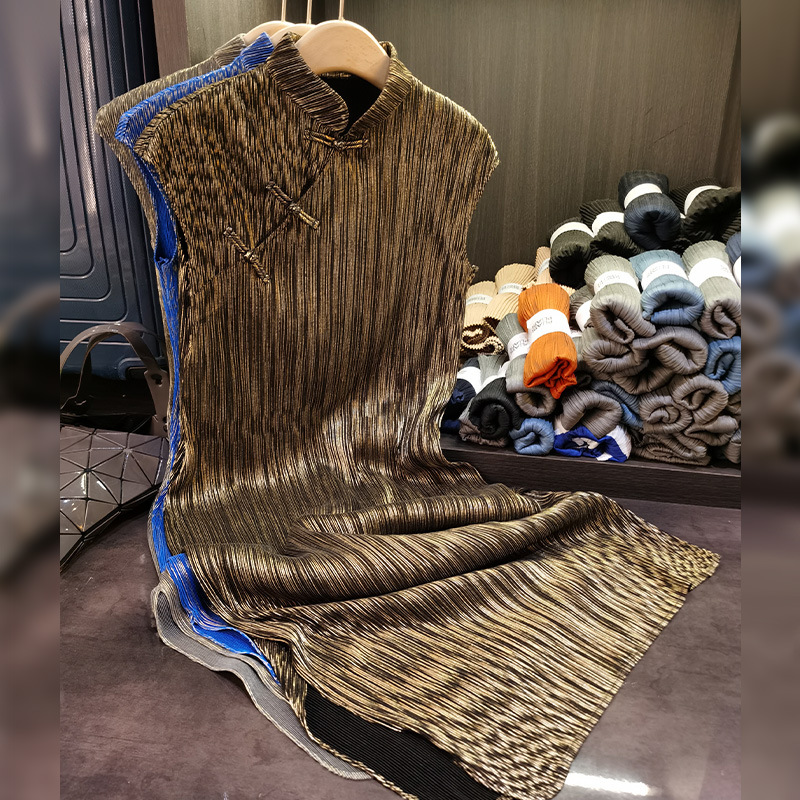 Sanzhai gaun berlipat lengan pendek, gaun lipit logam elegan kerah berdiri terbelah untuk wanita
