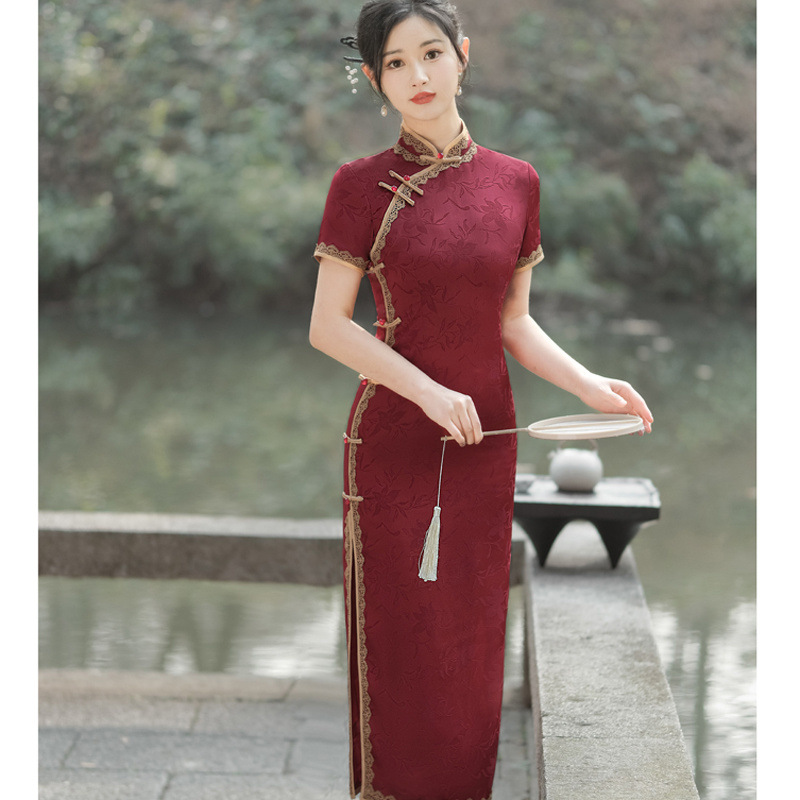 Gaun pernikahan Cheongsam merah happy mother-in-law 2024 baru musim panas pernikahan ibu gaun retro bordir asetat