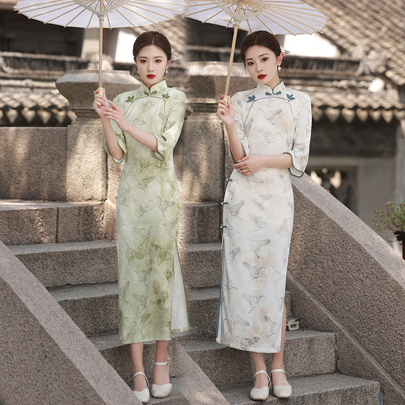 Qibai gaun cheongsam gaya Tiongkok, baju cheongsam setengah panjang temperamen, gaun ibu muda gaya Barat baru