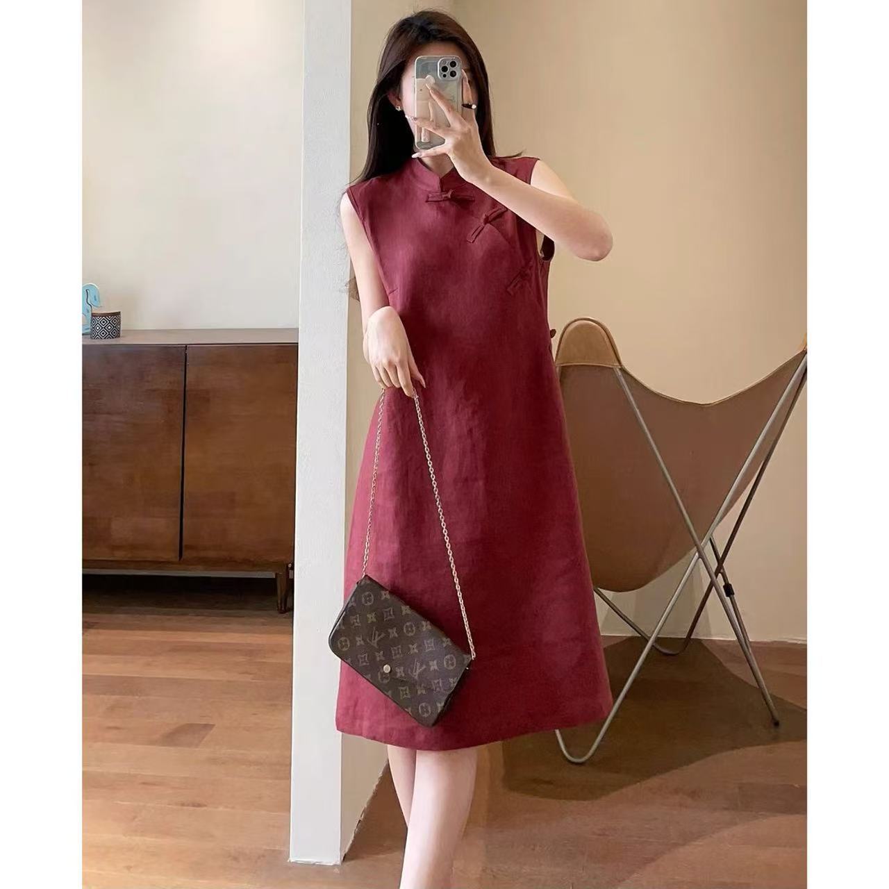 Rok Cheongsam Tanpa Lengan Linen Modifikasi Gaya Tiongkok Baru Gaun Rompi A-line Kancing Disk Buatan Tangan Wanita 25 Musim Panas H0506Q