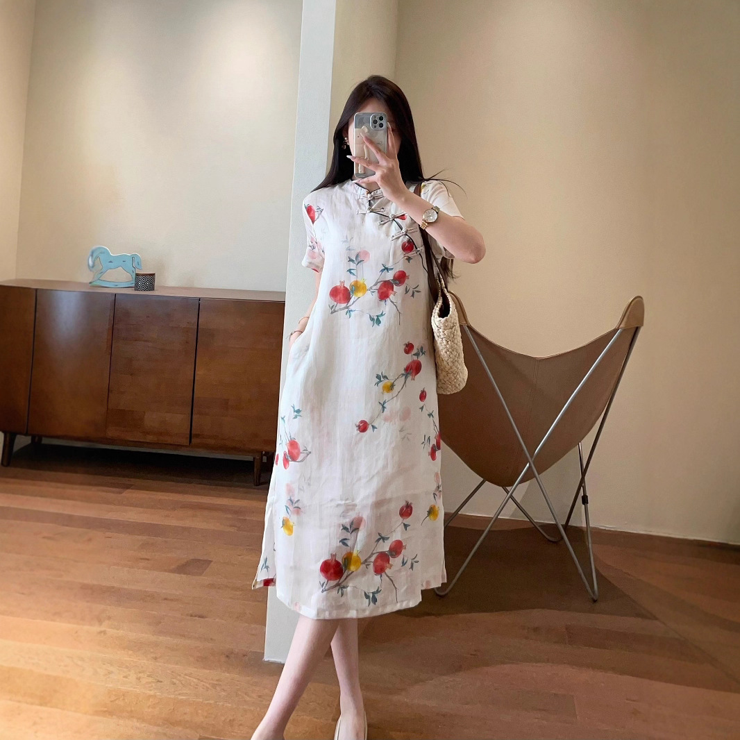 Rok Cheongsam Ramie Berkelas Tinggi Gaya Tiongkok Baru Gaun Panjang Sedang Motif Bunga Delima Wanita Musim Panas 2025