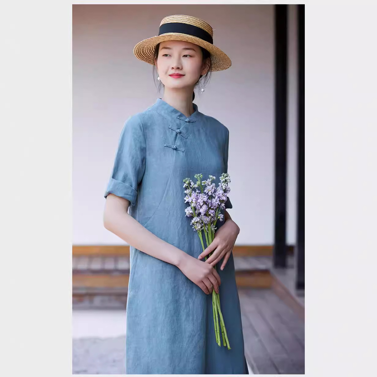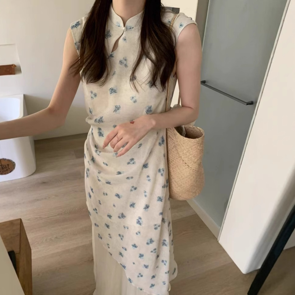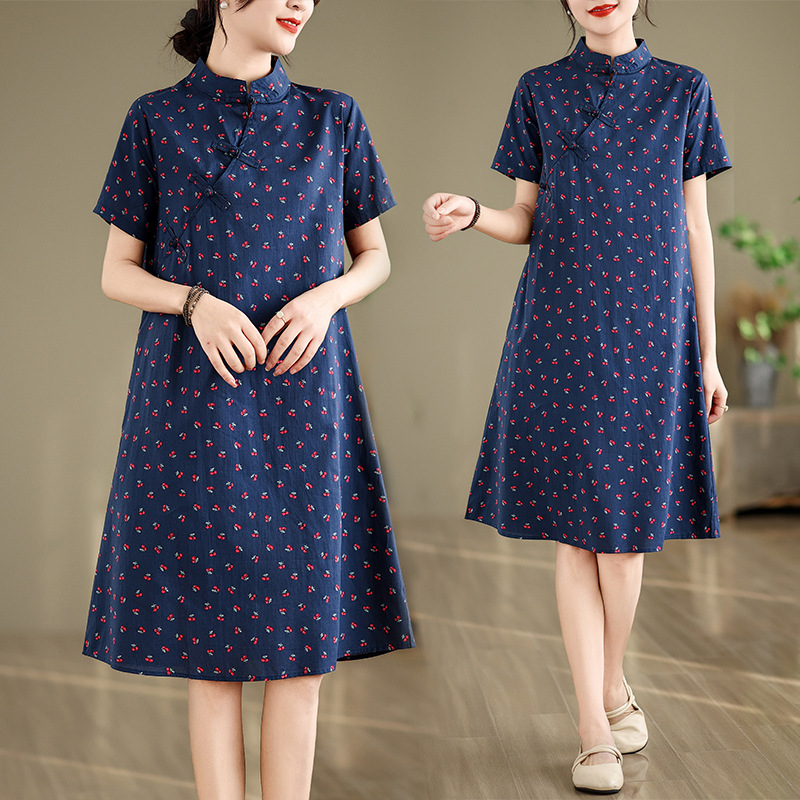 Real shot gaun cheongsam ditingkatkan China, Gaun longgar artistik bercetak katun Musim Panas 2024