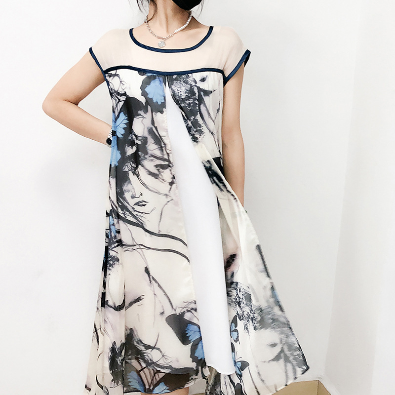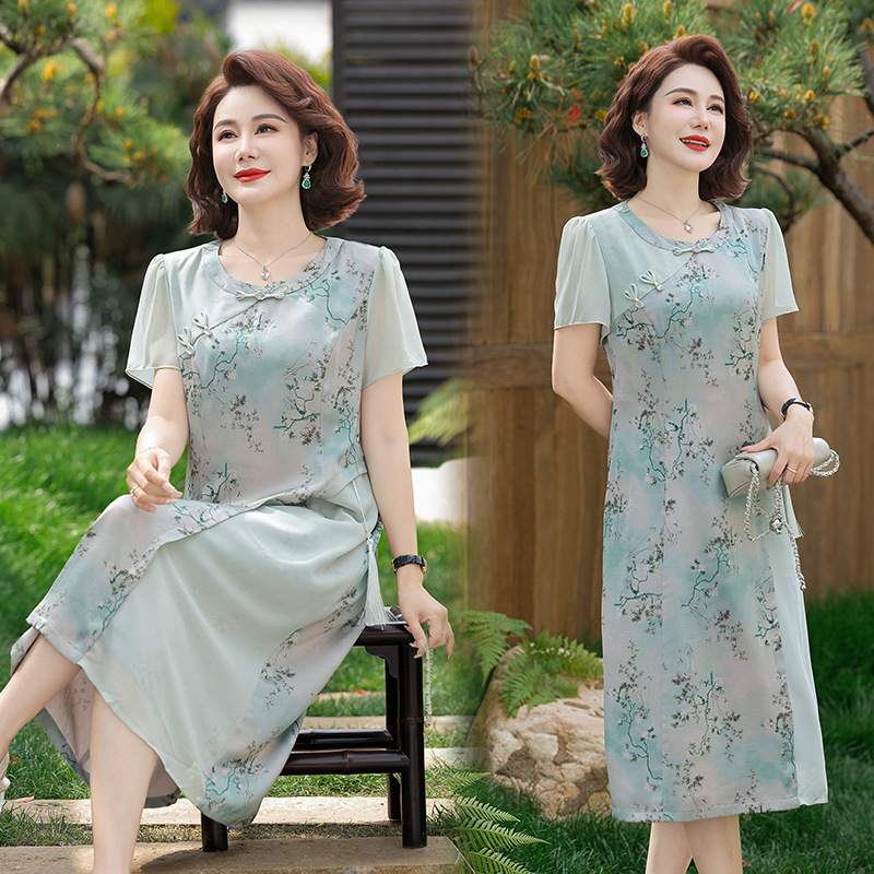 Pakaian Musim Panas Ibu Setengah Baya Gaun Gaya Barat Rok Terlihat Kurus Pelangsing Pinggang Wanita Paruh Baya Rok Cheongsam Modifikasi Elegan Model Musim Panas