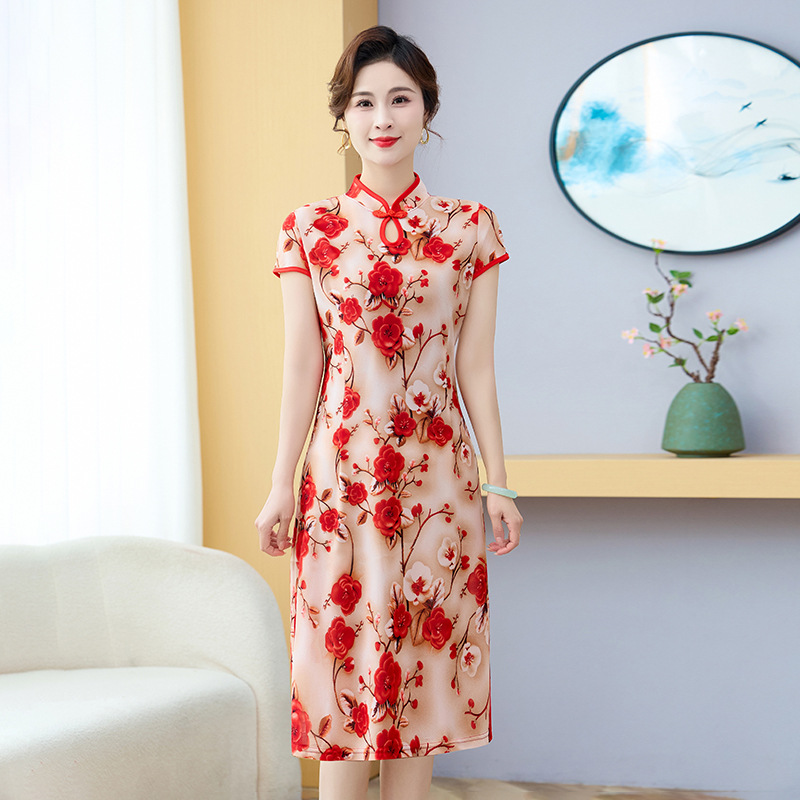Gaun cheongsam gaya ibu, baju sifon wanita setengah baya dan lansia, Gaun temperamen bangsawan ukuran besar 50