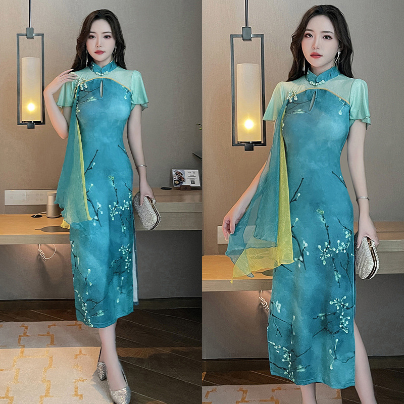 Gaun cheongsam klasik gaun seksi klub malam gaun malam ramping baju overall teknisi mandi kaki wanita klub malam