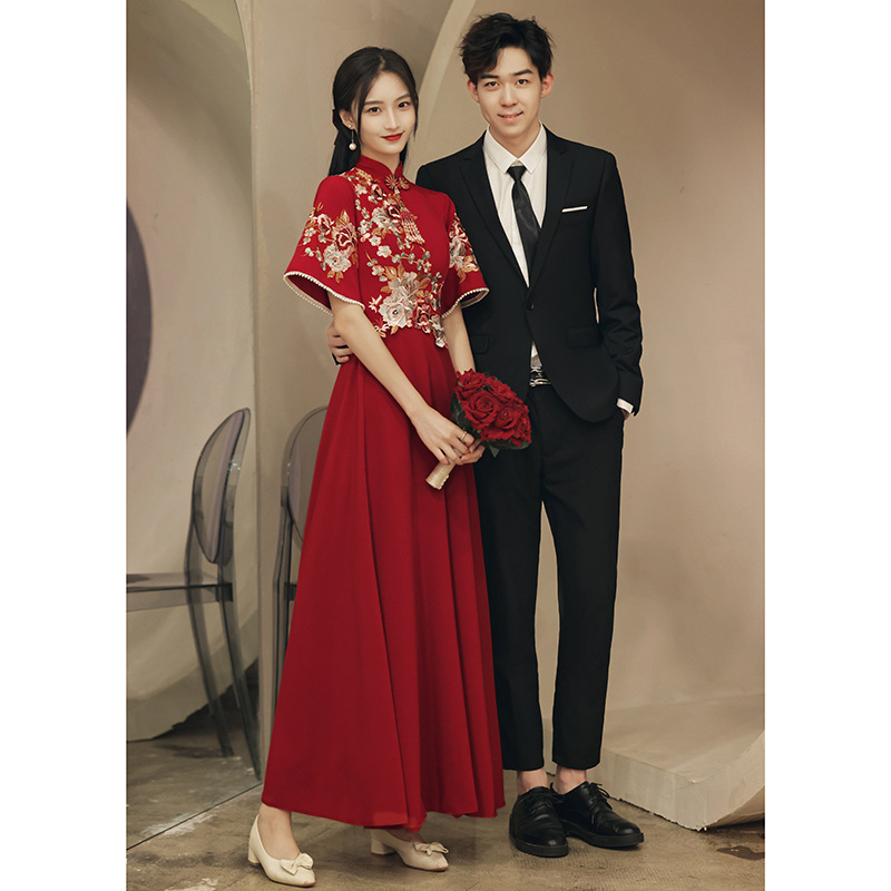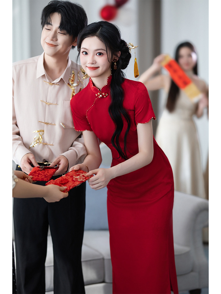 Cheongsam Merah Pakaian Bersulang Pengantin Wanita Gaun Pernikahan Musim Panas Model Baru Musim Panas 2025 Terlihat Langsing Kelas Atas Elegan Pintu Kembali Pernikahan