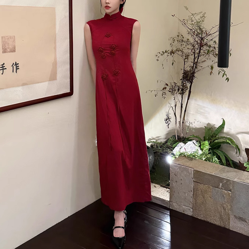 Gaun Cheongsam Bunga Warna Merah Gaya Tiongkok Baru Model Etoggle Model Baru 2025 Rok Wanita Bersulang Kancing Gaya Nasional