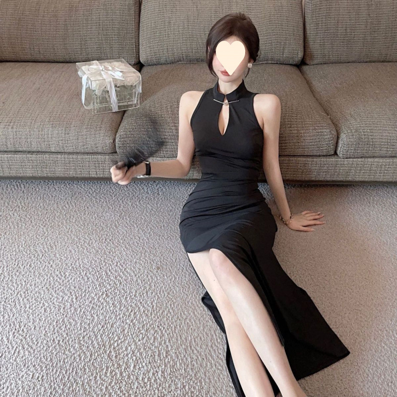 Gaun Pakaian Cheongsam Modifikasi Gaya Tiongkok Baru Gaya Nasional Gaun Gantung Leher Bahu Terbuka Seksi Menutupi Pinggul Ramping Warna Hitam Musim Panas