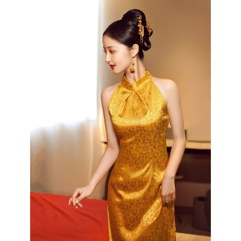 Jubah Pagi Pengantin Pernikahan Gaya Tiongkok Baru Cheongsam Modifikasi Pakaian Bersulang Wanita Gaun Pernikahan Tanpa Lengan Gaya Tiongkok Rok Panjang Pertunangan