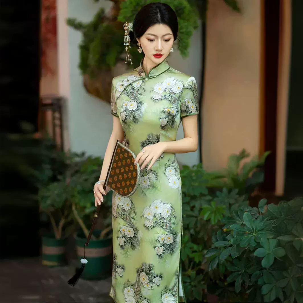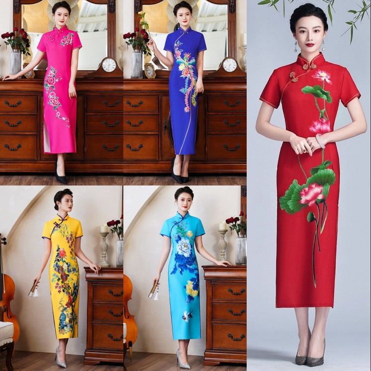 Gaun cheongsam harian panjang sedang, gaun cheongsam ukuran besar slim fit musim panas baru 2022