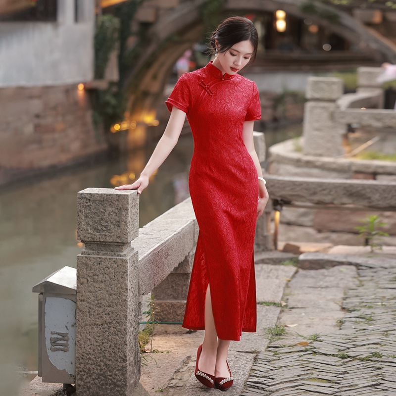 Gaya baru musim panas ujian pertunangan nasional jacquard panjang merah temperamen pelangsing pesta pernikahan cheongsam