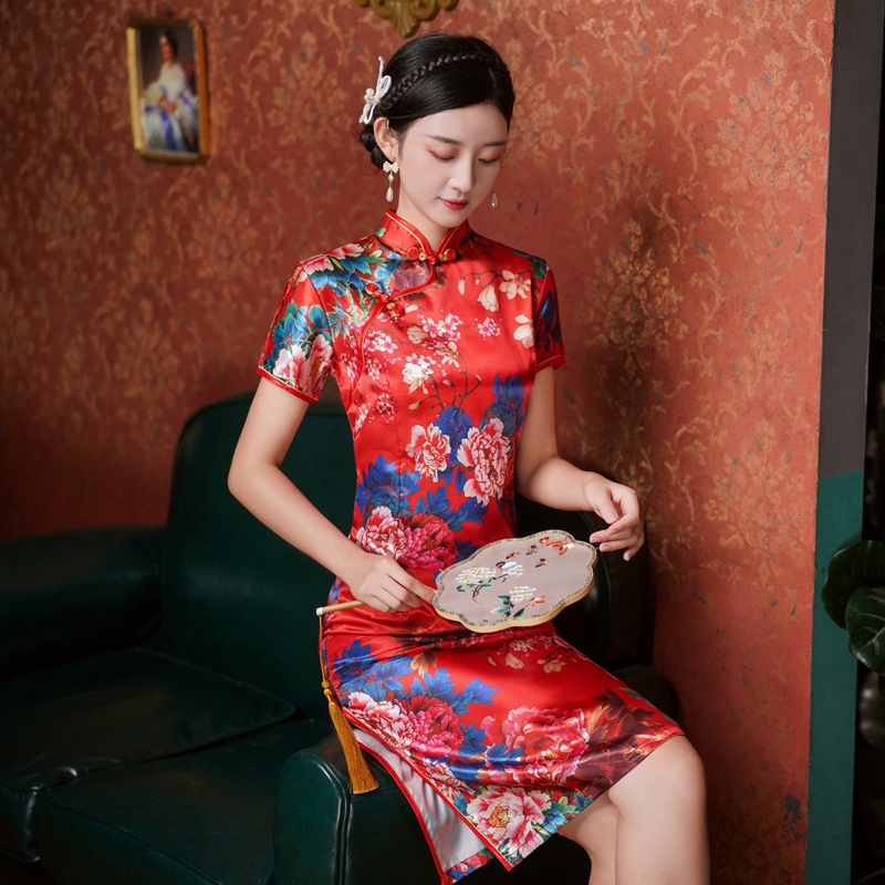 Cheongsam gaun cheongsam lengan pendek, gaun pelangsing harian kostum penampilan, gaun pentas pentas, gaun Cheongsam lengan pendek ukuran besar
