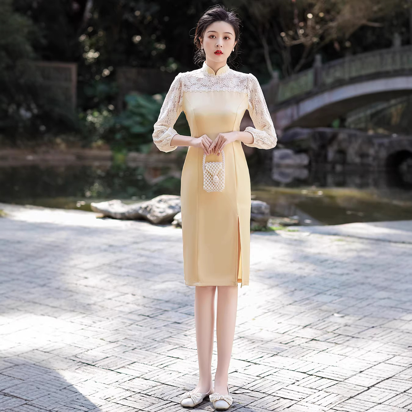Heqi gaun cheongsam pendek, sederhana Musim Semi dan musim panas 2022 elegan potongan ramping mode nyaman renda jahitan asetat ditingkatkan