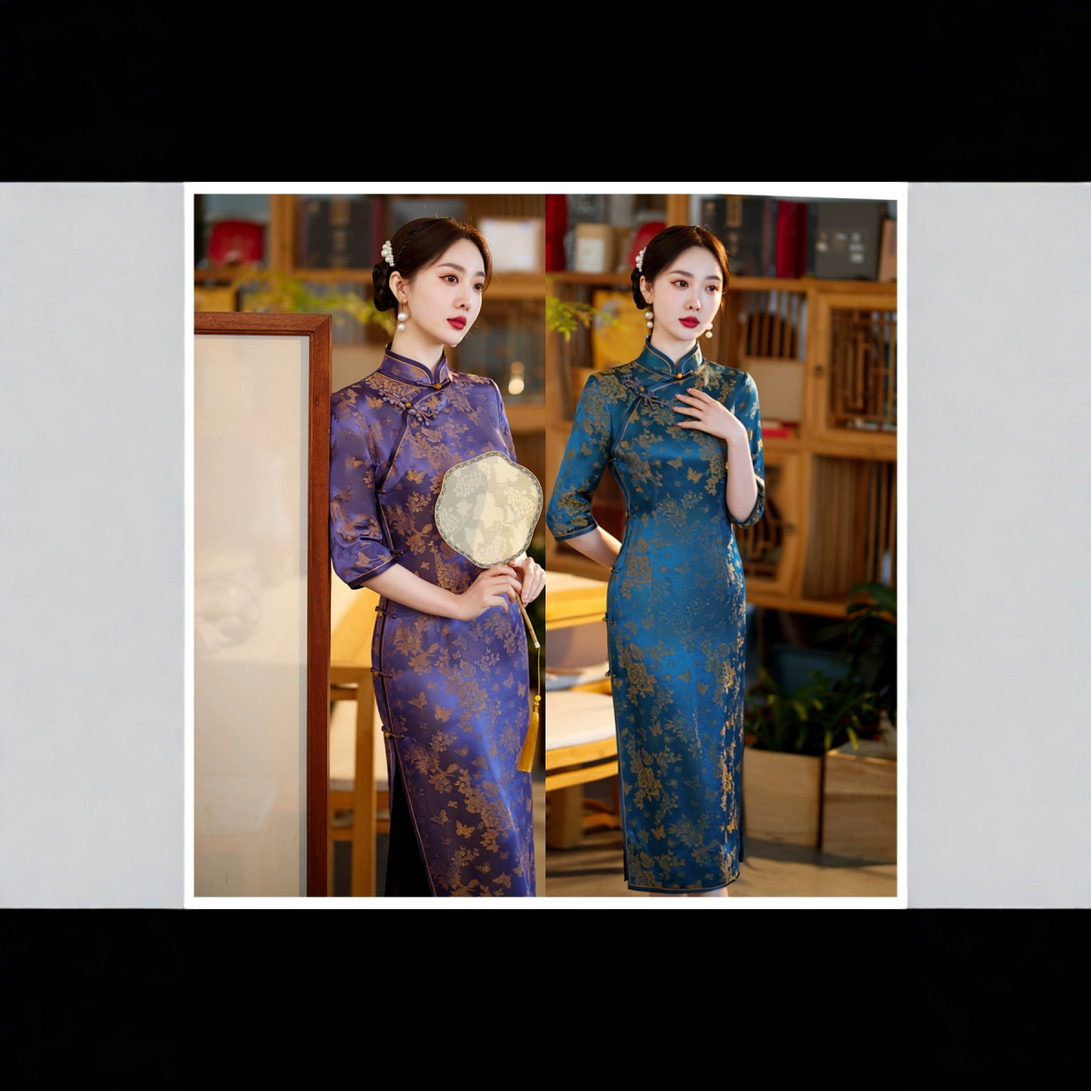 Gaun cheongsam Tiongkok biru dongker, Gaun wanita performa Pertemuan Tahunan baru 2022