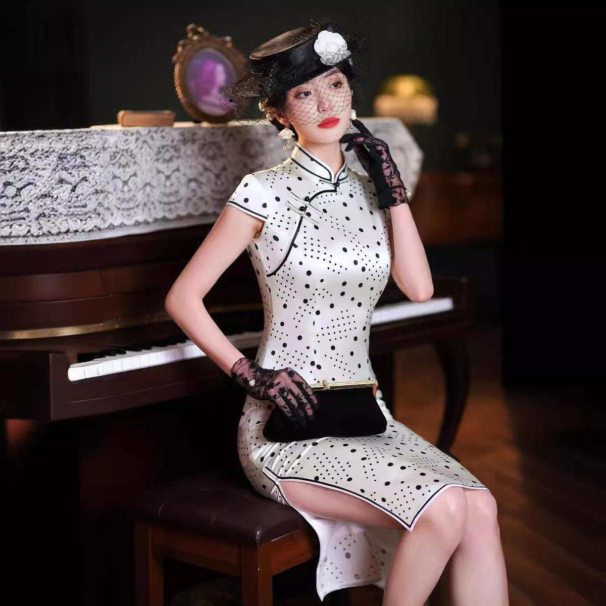 Gaun malam hitam retro komposit cheongsam, gaun malam pelangsing harian baru musim gugur dan musim dingin