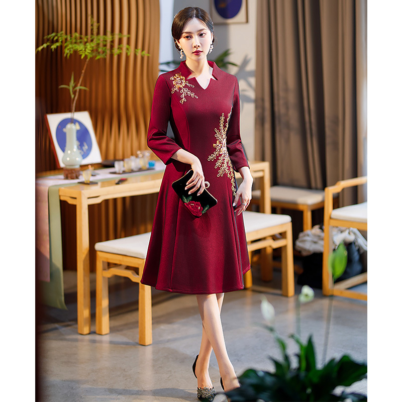 Baju cheongsam bordir ibu/Ibu, baju Cheongsam bordir baru, baju ibu hamil ukuran plus retro musim semi dan musim gugur
