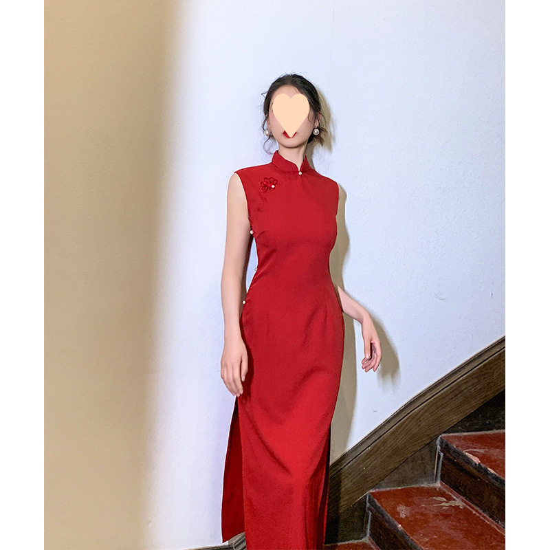 Cheongsam Merah Pakaian Bersulang Gaya Tiongkok Baru Pengantin Musim Panas Gaun Pernikahan Pertunangan Pengantin Wanita Musim Panas Tanpa Lengan Slim Fit