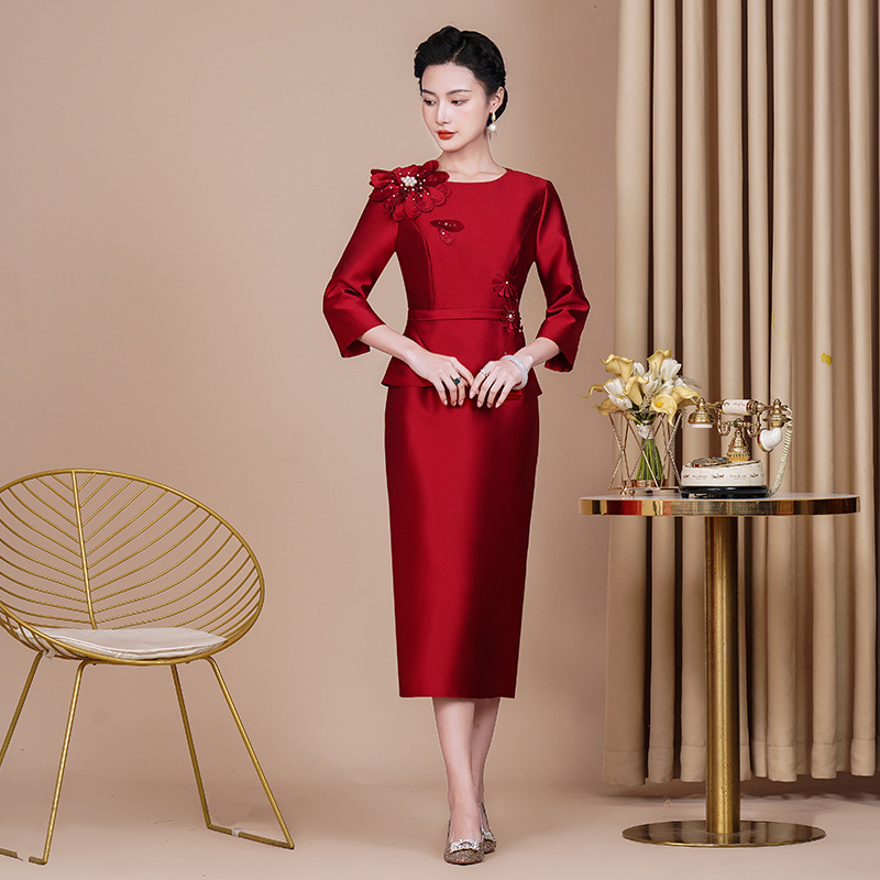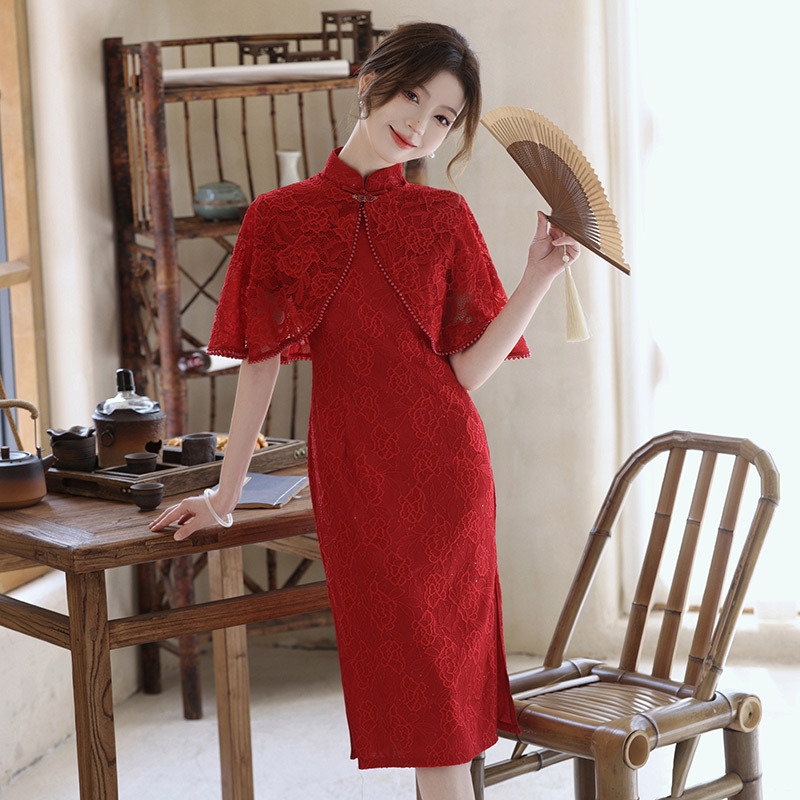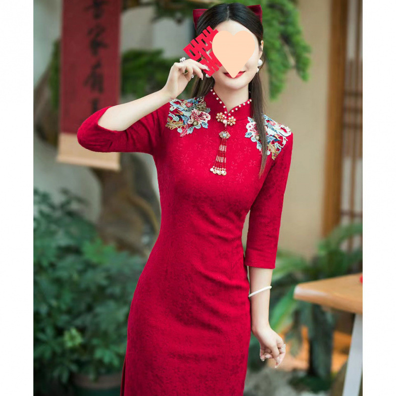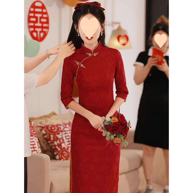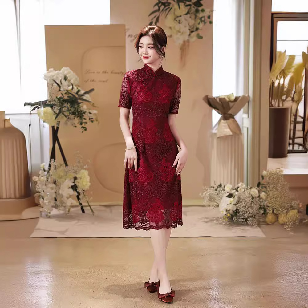 Gaun pengantin bersulang Cheongsam, gaun pernikahan ibu mertua renda merah anggur musim panas