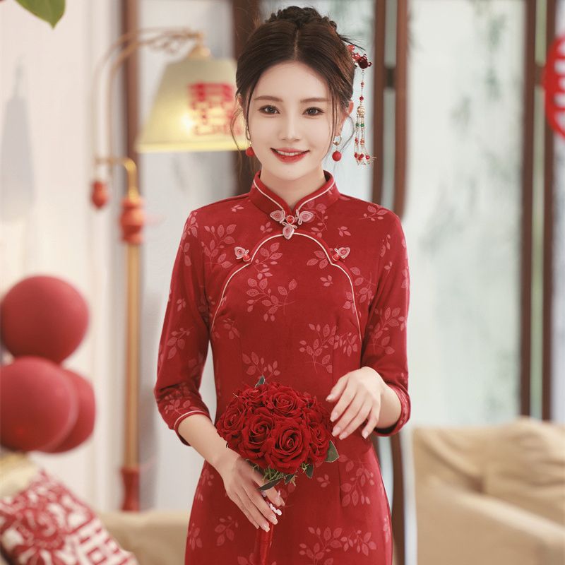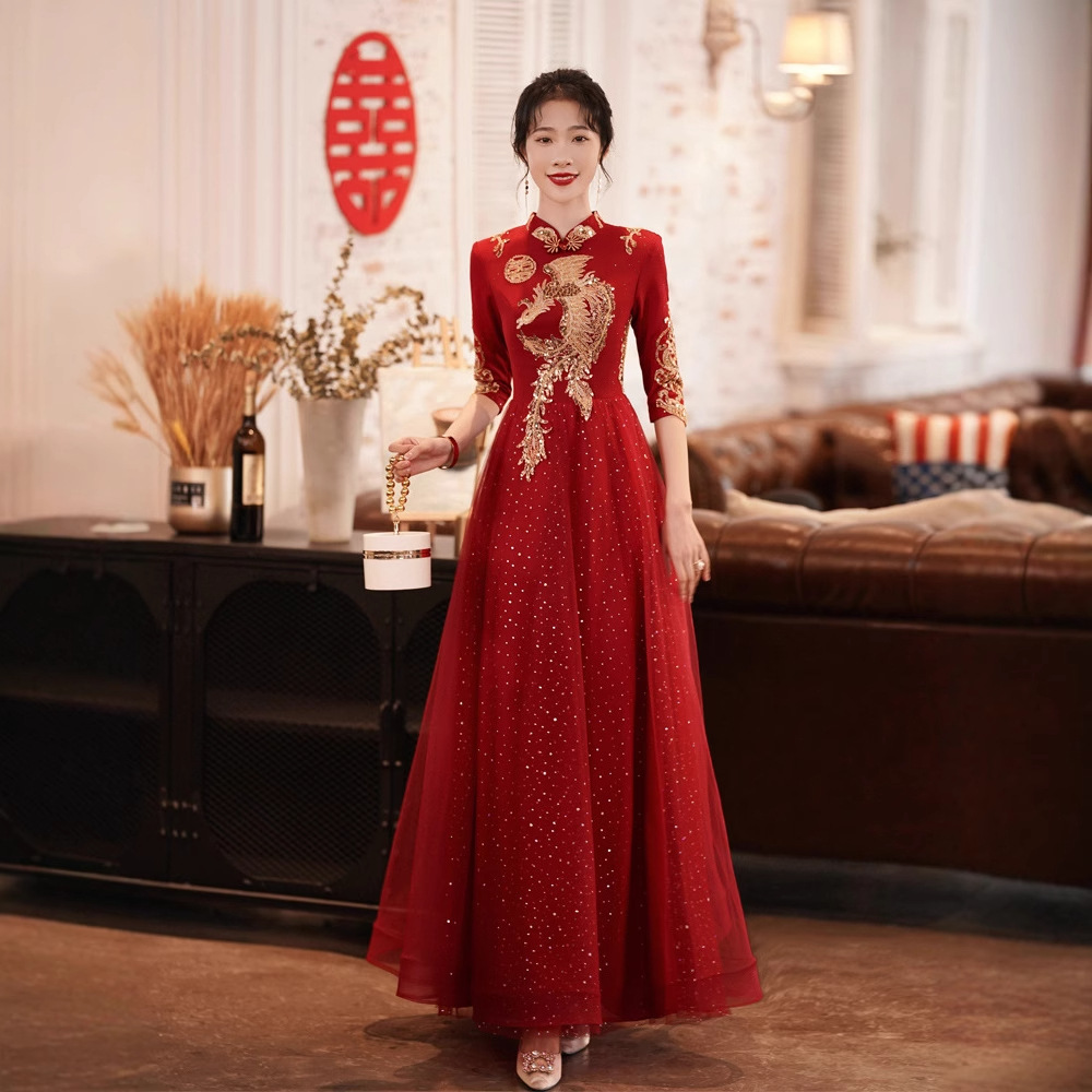 Gaun pengantin bersulang baru musim gugur dan musim dingin gaun pernikahan pertunangan Tiongkok kelas atas cheongsam pesta kembali ke pintu wanita