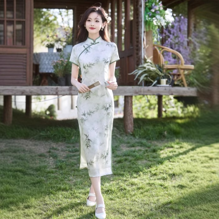 Cheongsam Modifikasi Hijau Musim Panas Model Baru Gaya Tiongkok Muda Gaya Daun Bambu Bercorak Motif Bunga Rok Cheongsam Niche