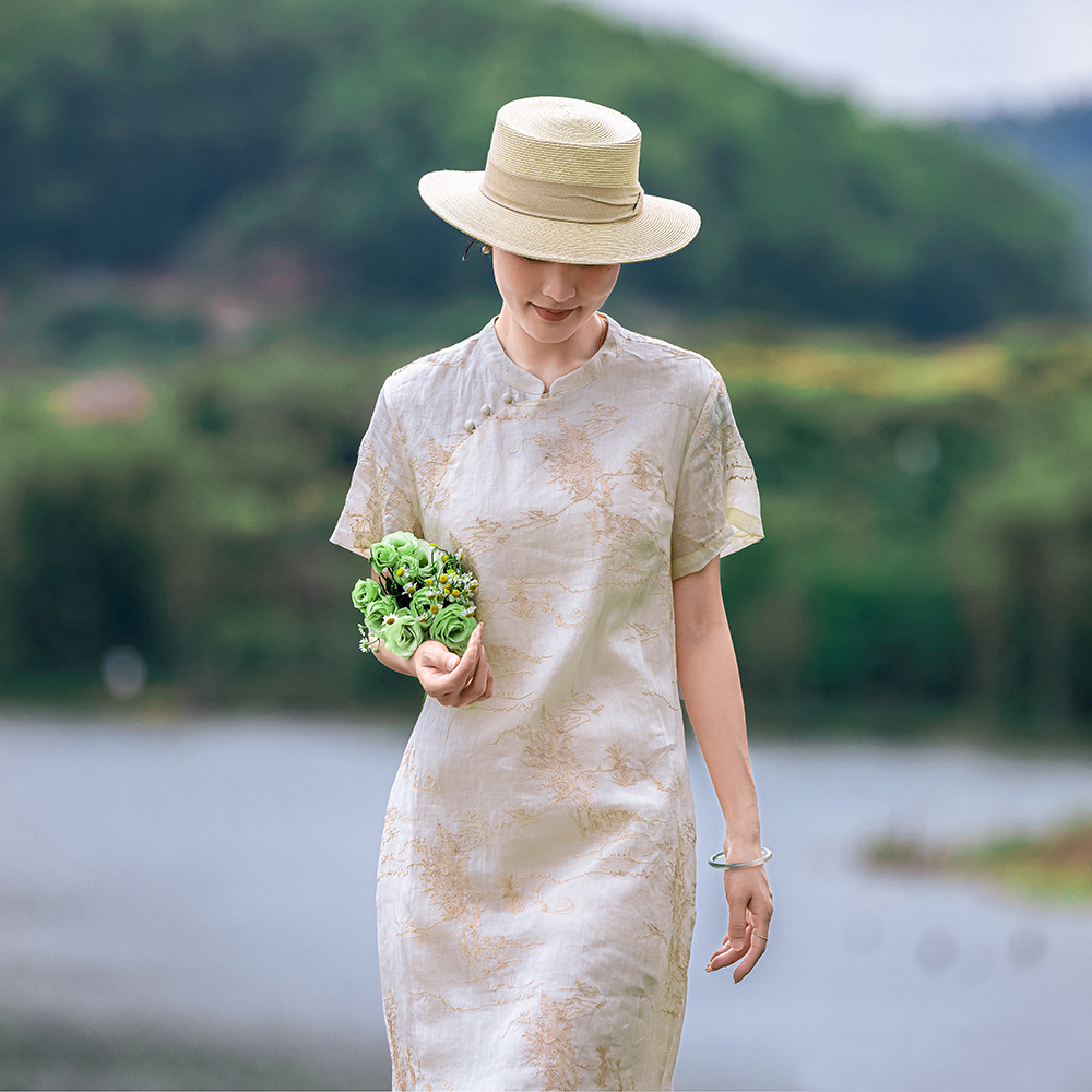 Gaun cheongsam ditingkatkan gaya nasional, gaun belah samping lengan pendek kerah berdiri kecil bordir rami baru musim panas 2024