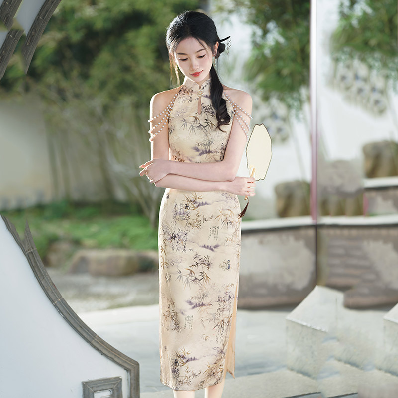Gaun cheongsam gaya Cina baru tanpa lengan dengan kerah halter 9195, gaya muda yang ditingkatkan, gaun wanita berpotongan ramping, elegan, seksi, dan retro.