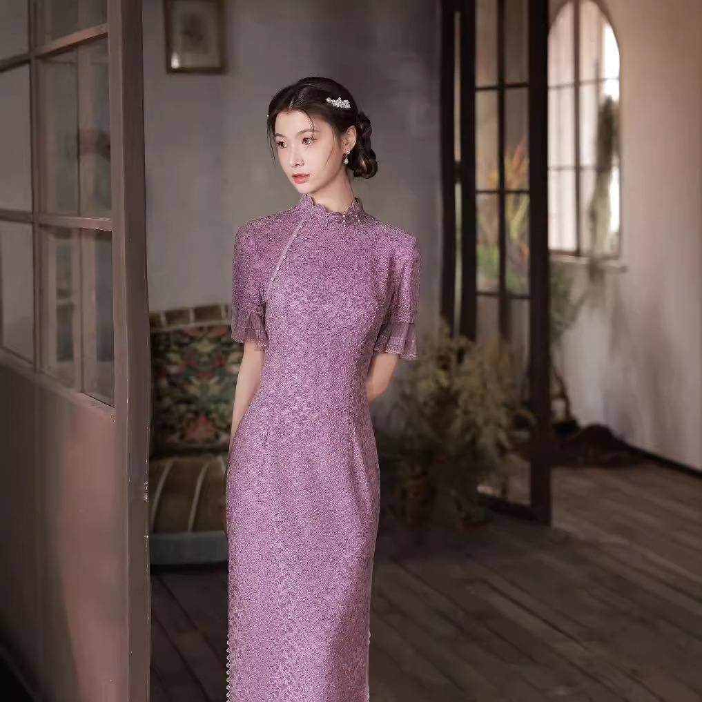 Gaun cheongsam renda ungu lembut model baru 2025, desain gaun toast yang elegan dan modifikasi, awet muda dan berkelas.