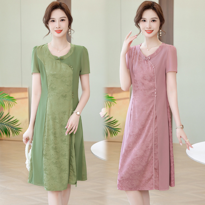 Rok Cheongsam Musim Panas Ibu Gaya Tiongkok Baru Pakaian Wanita Setengah Baya dan Tua Elegan Retro Rok Model Baru Musim Panas Gaun Gaya Barat