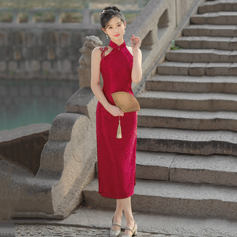 Gaun cheongsam merah model halter-neck bergaya Cina terbaru, model baru 2025 gaya muda yang ditingkatkan, gaun pesta retro slim-fit untuk gadis muda, musim panas.