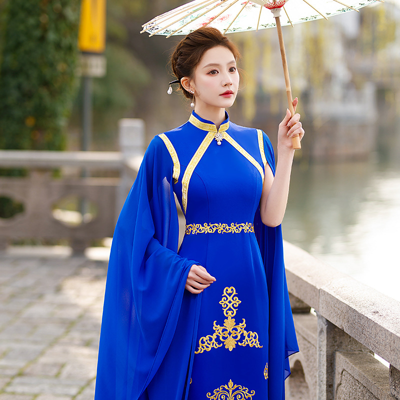 Gaun cheongsam biru baru berperforma tinggi, lengan pendek, untuk musim gugur dan musim dingin, panggung, catwalk, menutupi usia, ukuran besar, produsen grosir, pasokan grosir